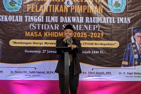 Ketua Senat Sekolah Tinggi Ilmu Dakwah Raudlatul Iman (STIDAR Sumenep) K. Junaidi, M.M., M.Pd.Imemberikan sambutan pada acara Studium General dan Pelantikan Pimpinan STIDAR masa Khidmah 2025-2030. Beliau mengajak hadirin untuk menggairahkan spirit pendidikan.