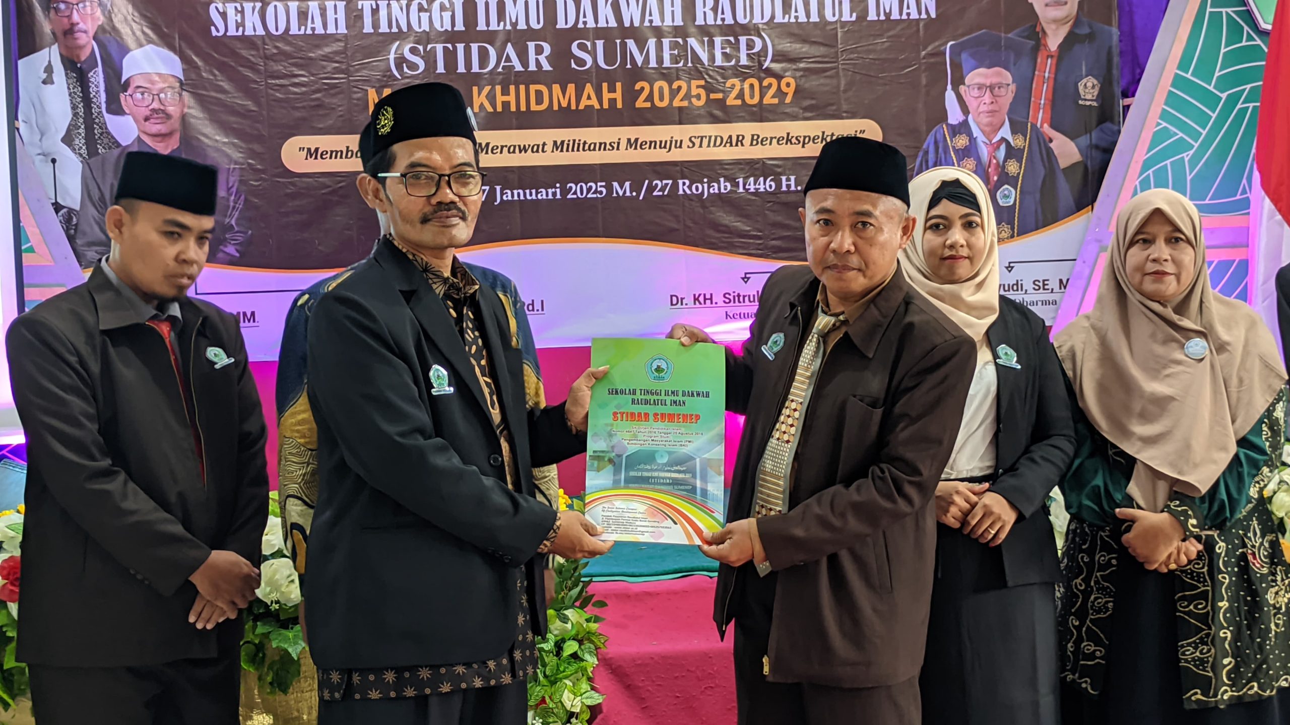 Pimpinan Sekolah Tinggi Ilmu Dakwah Raudlatul Iman (STIDAR) masa Khidmah 2025-2030 resmi dilantik oleh Ketua Yayasan Perguruan Tinggi Raudlatul Iman (YASPIRI) Dr. KH. Sahli Hamid, M.Pd.I. di Hall Ibrohimi Kampus STIDAR, Senin (27/1/2025).